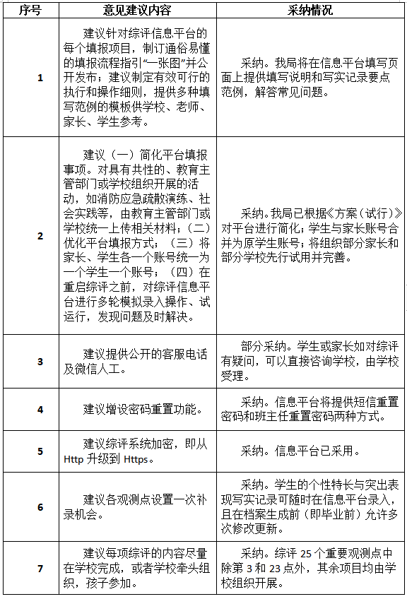 市教育局通報指出,在意見征集期間,該局共收到304個郵件及2個信件。市教育局對上述建議進行了統(tǒng)一的分類,這些建議被分成了34類,并組織了專家學者進行了認真研究。其中,有關平臺簡化、允許修改更新、建立綜評宣導隊伍等14類建議被采納,另有5類建議被部分采納,余下15類建議沒有被采納。