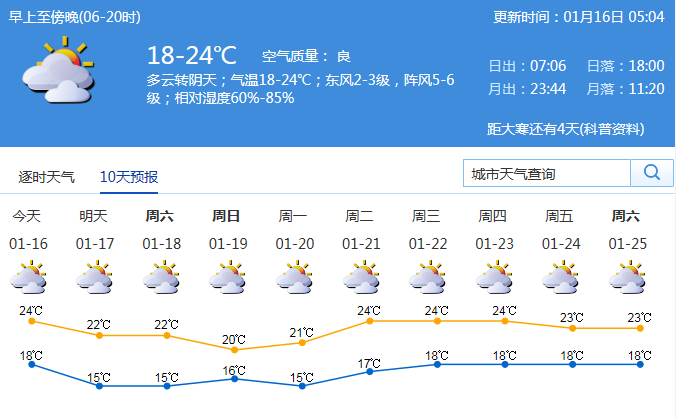 預(yù)計(jì)16日多云間陰天,氣溫17~24 ℃;17日多云,氣溫略降,15~22 ℃;18~22日多云,可見(jiàn)陽(yáng)光。