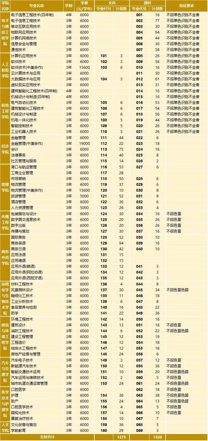②以下各招生專業(yè)、專業(yè)代號、計劃數(shù)、選報證書、特征要求等及其它備注以廣東省招生辦公布的專業(yè)目錄為準(zhǔn);