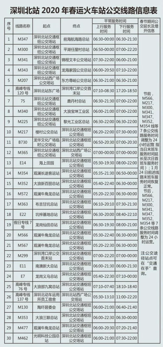 見圳客戶端·深圳新聞網(wǎng)2020年1月20日訊 又將迎來離深高峰,為方便大伙趕高鐵火車,深圳的公交地鐵都開啟最強(qiáng)加班模式,延長服務(wù)時間。很多小伙伴就很關(guān)心,途經(jīng)各大火車站的公交線有哪些?運(yùn)營的時間是幾點(diǎn)?