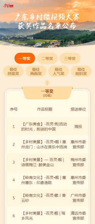廣東鄉(xiāng)村微視頻大賽一等獎(jiǎng)、最佳創(chuàng)意獎(jiǎng)獲獎(jiǎng)名單