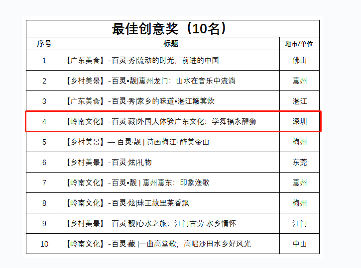 見圳客戶端·深圳新聞網(wǎng)2020年1月21日訊 1月20日,由省委宣傳部指導(dǎo)、“學(xué)習(xí)強(qiáng)國”廣東學(xué)習(xí)平臺主辦的廣東鄉(xiāng)村微視頻大賽獲獎(jiǎng)結(jié)果新鮮出爐。由深圳新聞網(wǎng)拍攝的《外國人體驗(yàn)廣東文化:學(xué)舞福永醒獅》從9375條參賽視頻中脫穎而出,獲得大賽一等獎(jiǎng)及最佳創(chuàng)意獎(jiǎng)。