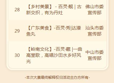 據(jù)了解,為慶祝新中國成立70周年,生動(dòng)展示黨的十八大以來,廣東高舉習(xí)近平新時(shí)代中國特色社會主義思想偉大旗幟、深入推進(jìn)美麗鄉(xiāng)村建設(shè)的豐碩成果,廣東鄉(xiāng)村微視頻大賽于8月20日正式啟動(dòng)。本次微視頻大賽歷時(shí)2個(gè)多月,共征集參賽作品9375條,審核展示5996條。廣東學(xué)習(xí)平臺PC端和手機(jī)APP開設(shè)參賽作品展播專題。經(jīng)過網(wǎng)上展播和網(wǎng)絡(luò)投票,以及專家評審,評選出一等獎(jiǎng)30名,二等獎(jiǎng)100名,三等獎(jiǎng)1000名,以及最佳創(chuàng)意獎(jiǎng)、最佳畫面獎(jiǎng)、最佳人氣獎(jiǎng)各10名。佛山、廣州、惠州等10個(gè)地級以上市黨委宣傳部獲大賽組織獎(jiǎng)。