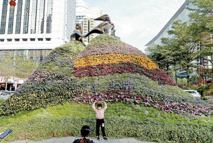 ▲國貿(mào)廣場(chǎng)前"愛神永駐"花塑。