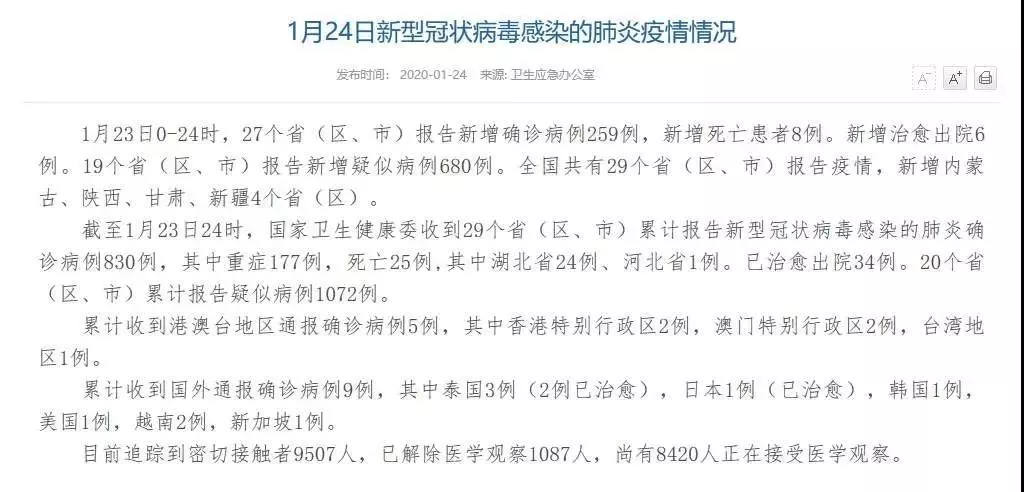 國(guó)家衛(wèi)建委通報(bào):1月23日0-24時(shí),27個(gè)?。▍^(qū)、市)報(bào)告新增確診病例259例,新增死亡患者8例。新增治愈出院6例。19個(gè)?。▍^(qū)、市)報(bào)告新增疑似病例680例。全國(guó)共有29個(gè)?。▍^(qū)、市)報(bào)告疫情,新增內(nèi)蒙古、陜西、甘肅、新疆4個(gè)省(區(qū))。