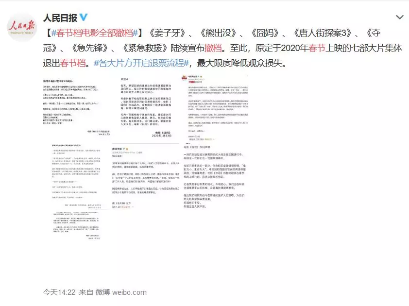 因“擔(dān)憂疫情進(jìn)一步擴(kuò)散”、“考慮影院密閉空間的病源傳播風(fēng)險(xiǎn)”等因素,23日,2020春節(jié)檔的七部影片《唐人街探案3》《囧媽》《奪冠》《緊急救援》《姜子牙》《熊出沒(méi)·狂野大陸》《急先鋒》集體宣布撤檔,均將擇日再映。各大片方開(kāi)啟退票流程,最大限度降低觀眾損失。