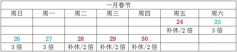 1月25日、26日、27日屬于法定節(jié)假日,應(yīng)支付三倍工資。1月24日、28日、29日、30日屬于休息日,如果公司不安排補(bǔ)休,則應(yīng)支付二倍工資。