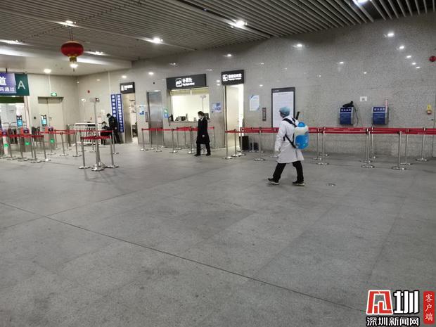 深圳火車站工作人員對候車室、站臺等區(qū)域進(jìn)行消殺。