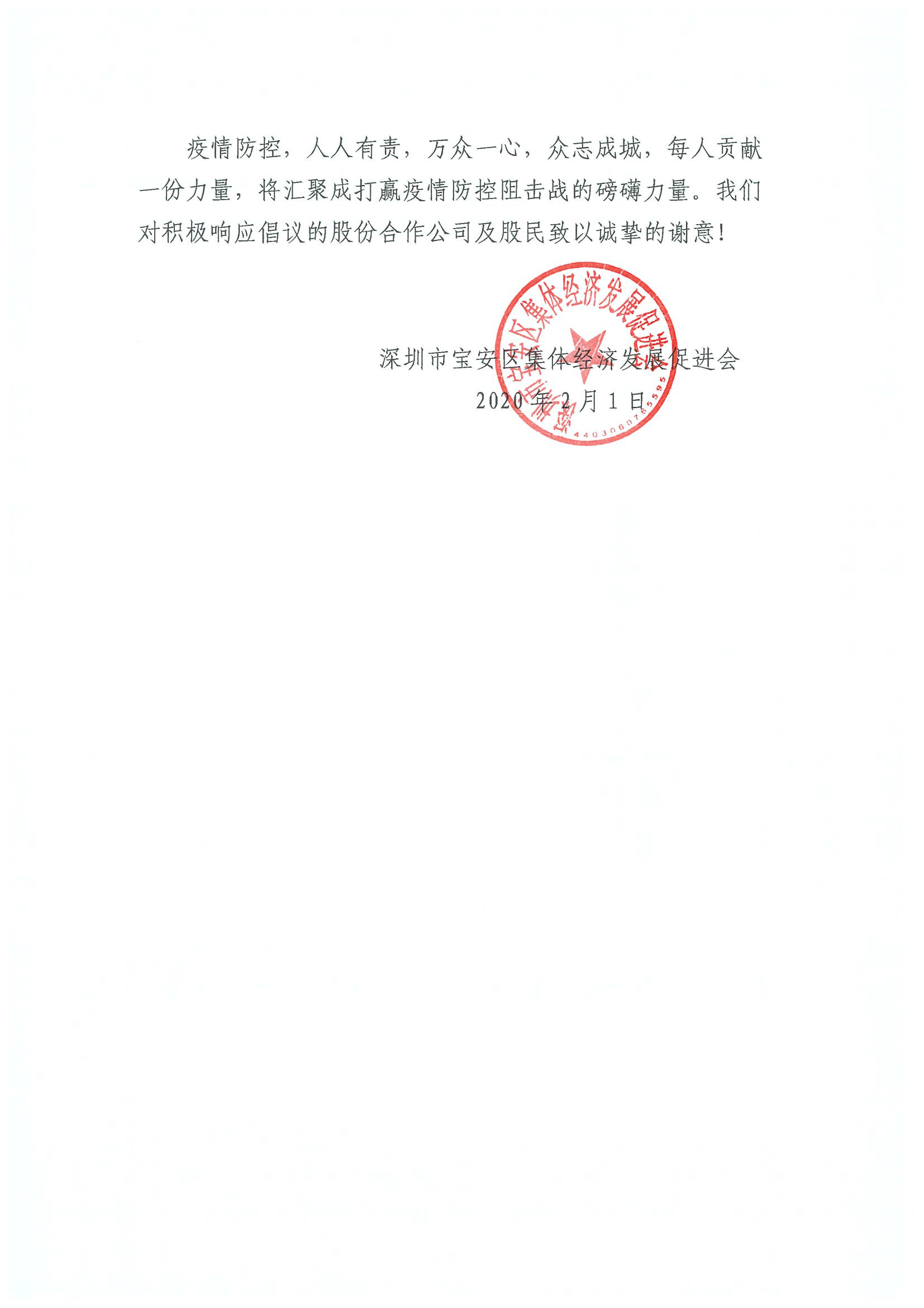 深圳新聞網寶安訊 “疫情防控,人人有責,萬眾一心,眾志成城,每人貢獻一份力量,將匯聚成打贏疫情防控阻擊戰(zhàn)的磅礴力量?!?月1日晚,寶安區(qū)集體資產管理局指導寶安區(qū)集體經濟發(fā)展促進會向寶安區(qū)各社區(qū)股份合作公司、全體股份合作公司股民發(fā)出《同心協(xié)力共克時艱適當減免企業(yè)及來深務工人員租金的倡議書》,號召全區(qū)股份合作公司及股民適當減免企業(yè)及來深務工人員15-30天租金及物業(yè)費,并根據疫情防控的需要可再次追加減免。