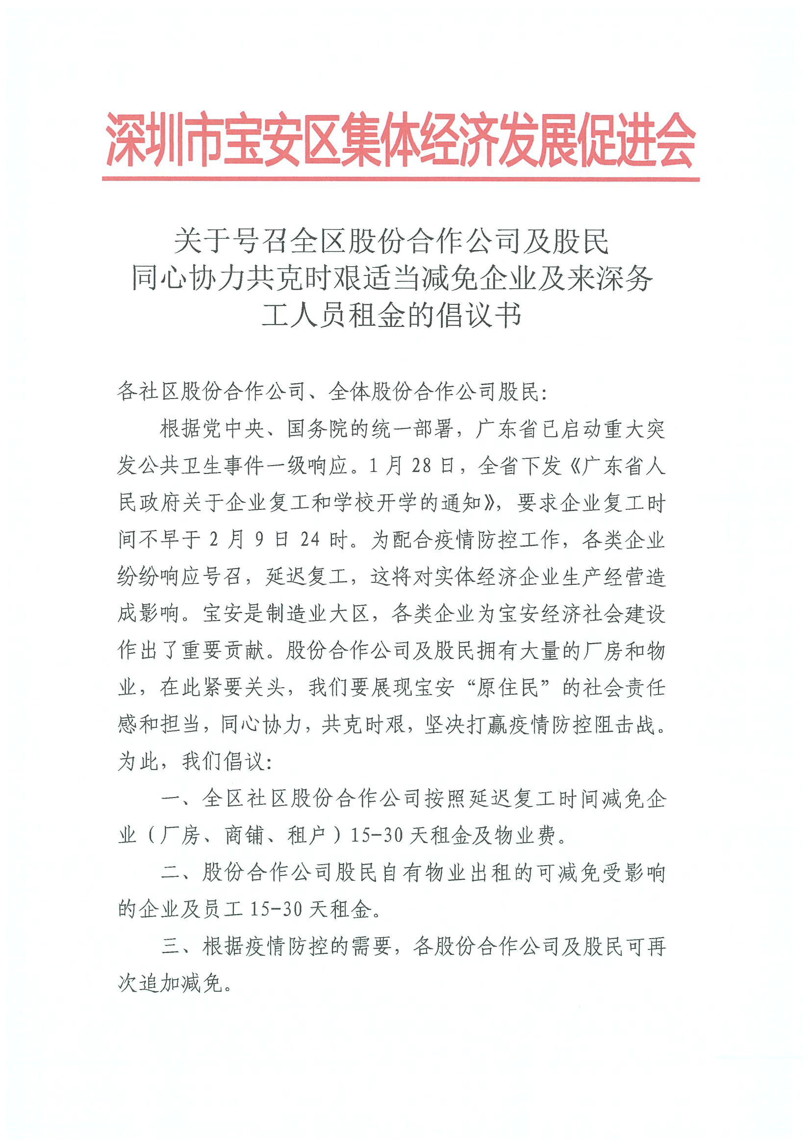 倡議書中寫道,為配合疫情防控工作,各類企業(yè)紛紛響應號召,延遲復工,這將對實體經濟企業(yè)生產經營造成影響。寶安是制造業(yè)大區(qū),各類企業(yè)為寶安經濟社會建設作出了重要貢獻。股份合作公司及股民擁有大量的廠房和物業(yè),在此緊要關頭,我們要展現(xiàn)寶安“原住民”的社會責任感和擔當,同心協(xié)力,共克時艱,堅決打贏疫情防控阻擊戰(zhàn)。為此,寶安區(qū)集體資產管理局指導寶安區(qū)集體經濟發(fā)展促進會發(fā)起倡議,號召全區(qū)股份合作公司及股民按照延遲復工時間減免企業(yè)(廠房、商鋪、租戶)15-30天租金及物業(yè)費;股份合作公司股民自有物業(yè)出租的可減免受影響的企業(yè)及員工15-30天租金;同時,根據疫情防控的需要,各股份合作公司及股民可再次追加減免。
