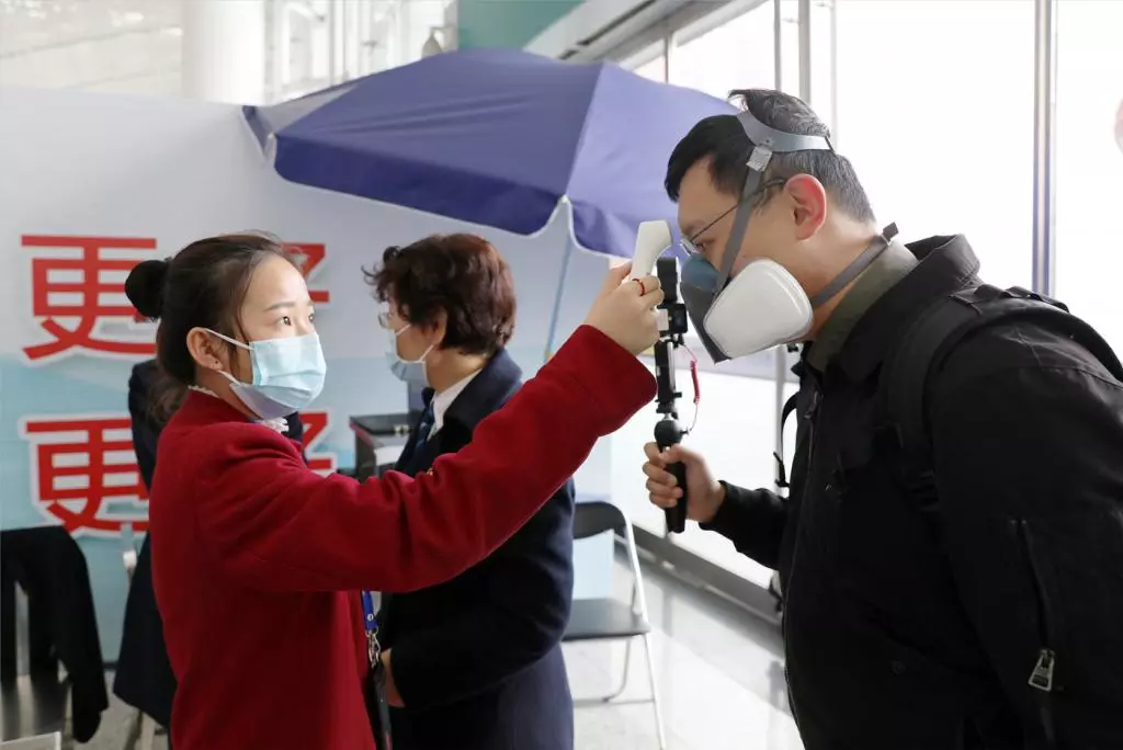 深圳北站工作人員對旅客進(jìn)行體溫檢查。