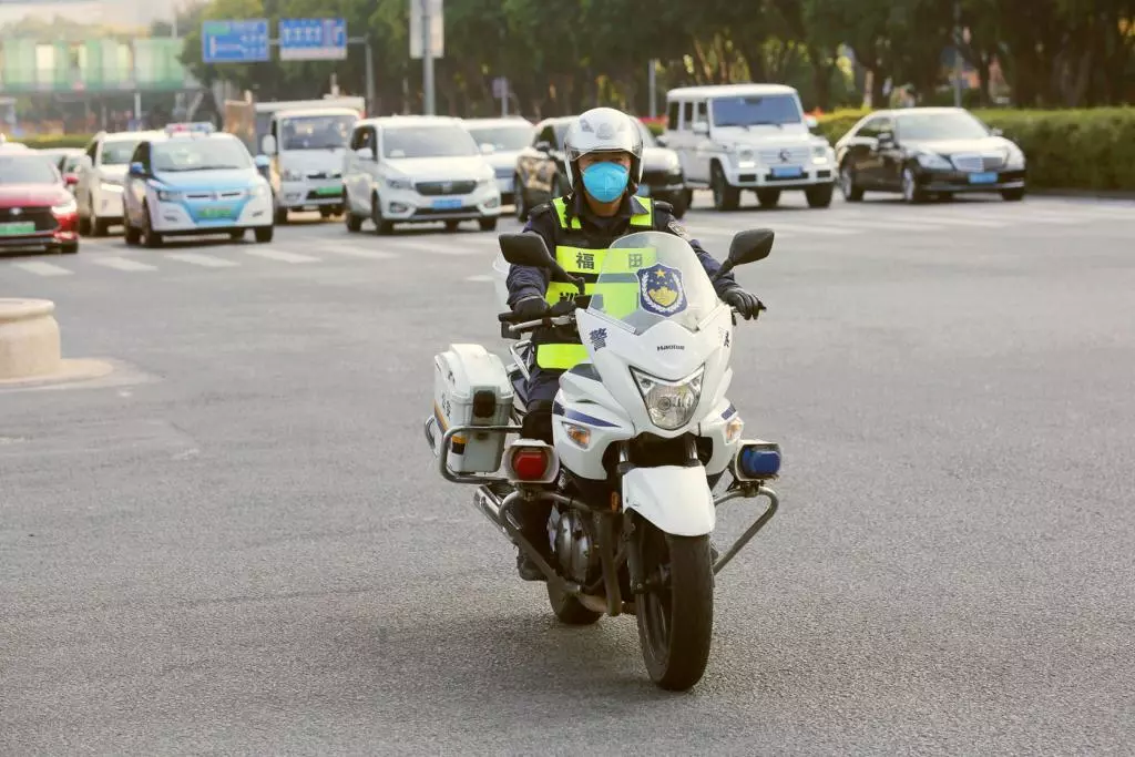 交警佩戴口罩開展路面巡邏。