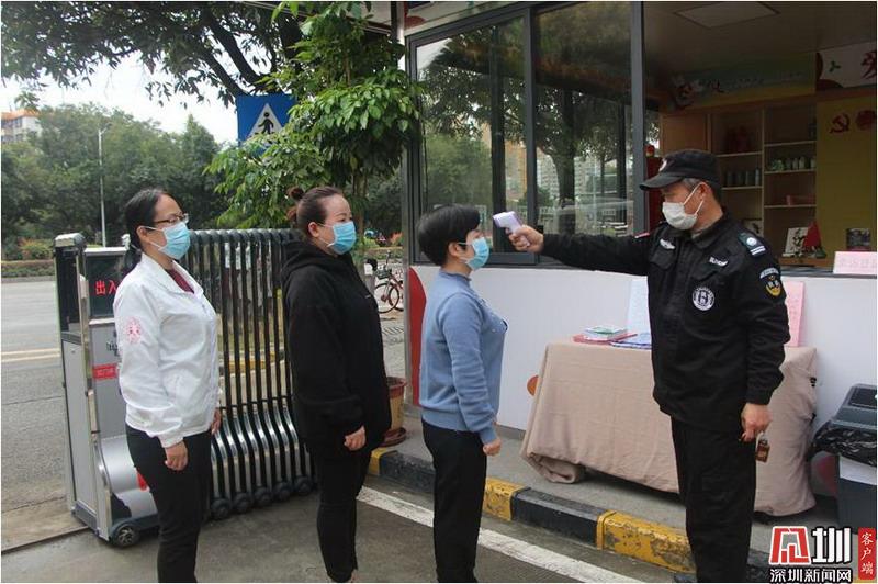 上午8點30分,海樂社區(qū)黨群服務(wù)中心社區(qū)工作站的保安正為義工測量體溫。
