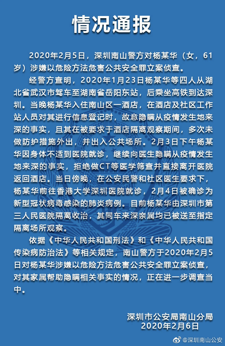 依據(jù)《中華人民共和國(guó)刑法》和《中華人民共和國(guó)傳染病防治法》等相關(guān)規(guī)定,南山警方于2020年2月5日對(duì)楊某華涉嫌以危險(xiǎn)方法危害公共安全罪立案?jìng)刹?,?duì)其家屬幫助隱瞞相關(guān)事實(shí)的情況,正在進(jìn)一步調(diào)查中。