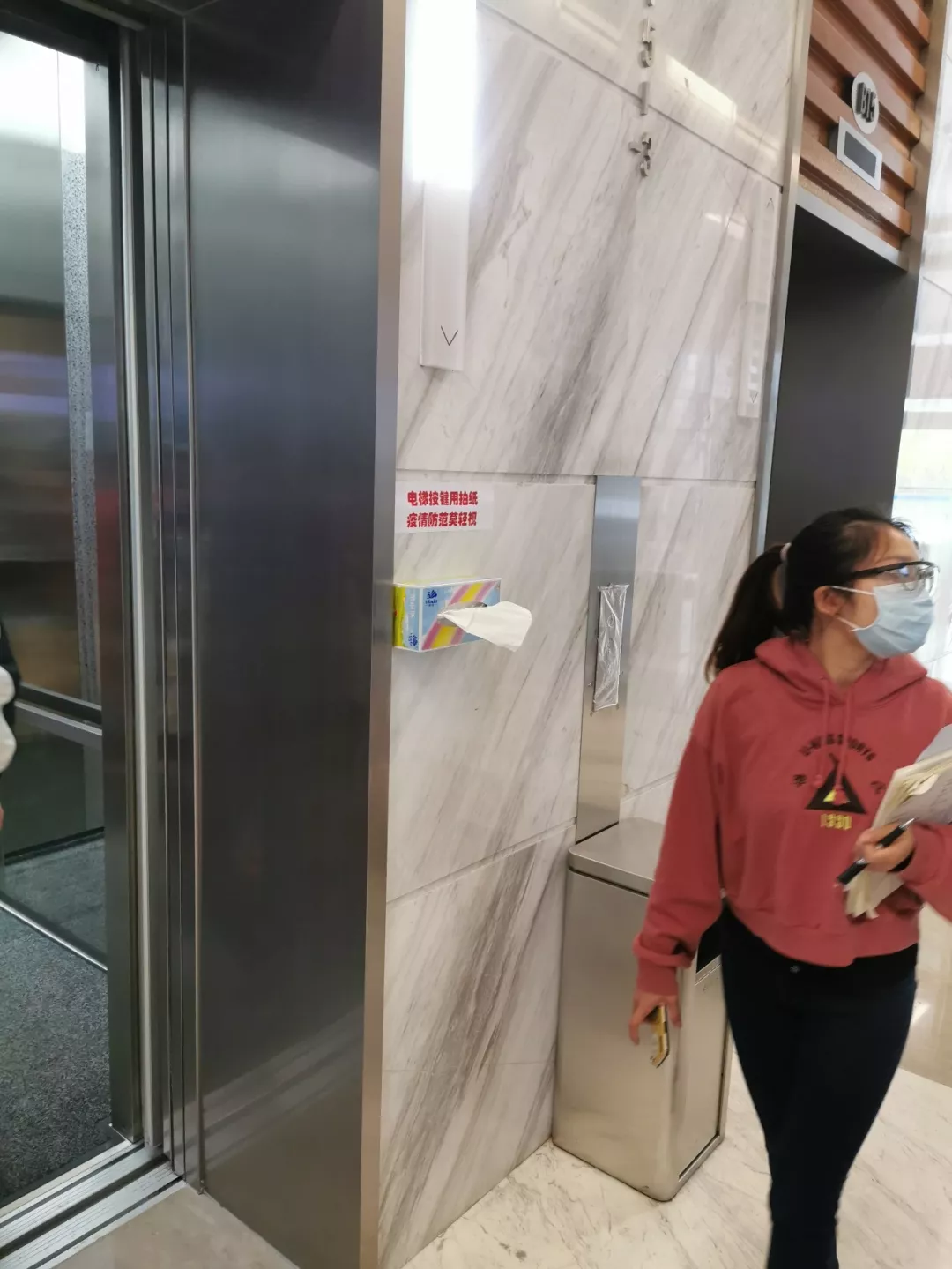 寫(xiě)字樓電梯處放有抽紙。新華社記者孫飛2月7日攝