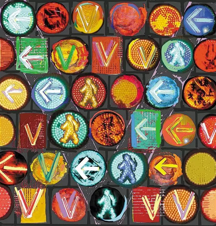 梁宇透露,這件作品的創(chuàng)作四易其稿,將信號(hào)燈所指代的“社會(huì)規(guī)則”加以排列強(qiáng)化,以此強(qiáng)調(diào)“秩序”本身在與疾病博弈混亂環(huán)境中的重要性。作品以濃烈的對(duì)比色彩、緊密排列的幾何圖形試圖傳達(dá)當(dāng)下人們的緊張情緒和焦慮心態(tài)。同時(shí),信號(hào)燈中“行走”、“前進(jìn)”、“Victory”的提示標(biāo)識(shí),被清晰地提煉出來(lái),成為能讓畫面安定的因素,望帶給觀者一點(diǎn)思緒的寧?kù)o與心靈的慰藉。