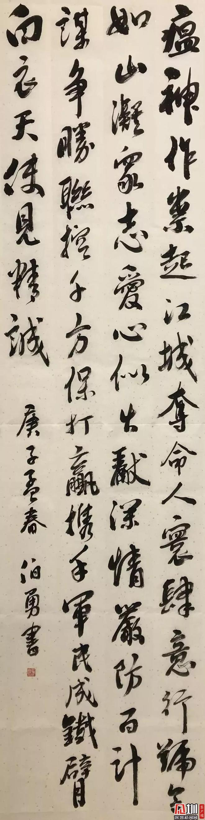 見(jiàn)圳客戶(hù)端.深圳新聞網(wǎng)訊(記者 鄭創(chuàng)彬)連日來(lái),新型冠狀病毒肺炎疫情牽動(dòng)著每一個(gè)國(guó)人的心。2月11日,記者從鹽田區(qū)文聯(lián)獲悉,鹽田區(qū)書(shū)法家協(xié)會(huì)的成員們,雖不能和醫(yī)務(wù)工作者等直奔前線,卻無(wú)不心系疫情,利用自己手中的筆墨,以文藝作品鼓舞士氣,創(chuàng)作了許多凝聚力量的佳作,為打贏疫情防控阻擊戰(zhàn)加油助威。