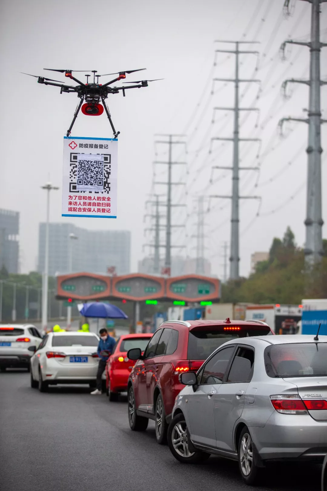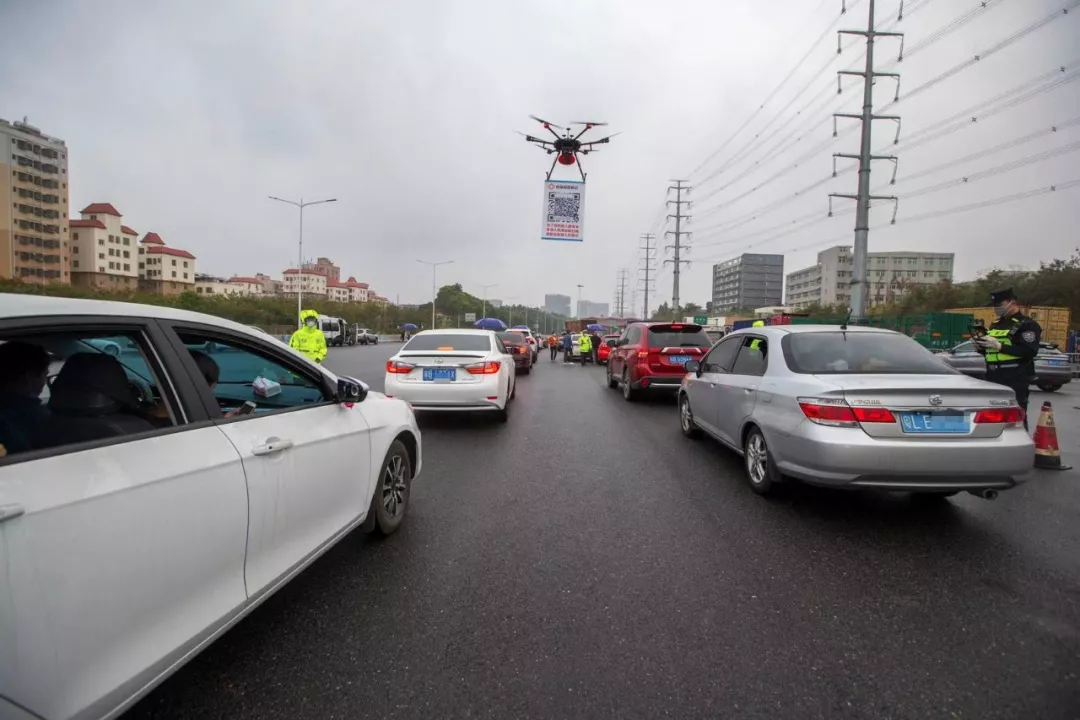 隨著返深車輛和人員的增加,深圳從8日開始啟用線上車輛申報(bào)登記。為提高申報(bào)效率,搭載喊話器、懸掛申報(bào)二維碼的無人機(jī)成為防疫一線工作人員的得力助手。民警操作無人機(jī)在車輛隊(duì)伍中穿梭,并通過喊話器提醒駕乘人員掃碼登記,減少人員接觸的同時(shí)提高了效率。