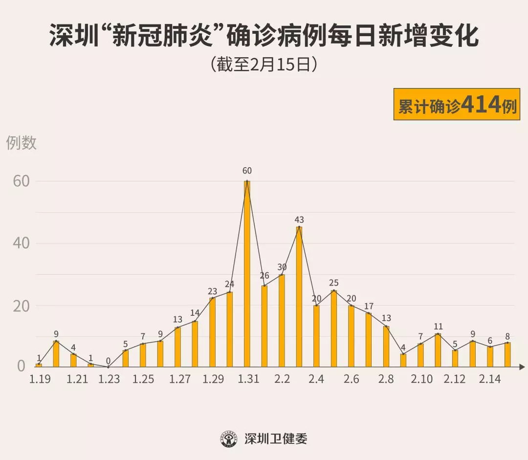 截至2月15日24時(shí),深圳累計(jì)報(bào)告“新冠肺炎”確診病例414例。2月15日當(dāng)天全市新增確診病例8例(個(gè)案詳情今晚公布)。 ▲新增出院病例已超過新增確診病例 累計(jì)報(bào)告確診病例中,男性195例、女性219例。 按照病例管理地區(qū)劃分,南山區(qū)87例、福田區(qū)78例、龍崗區(qū)71例、寶安區(qū)62例、龍華區(qū)34例、羅湖區(qū)32例、光明區(qū)11例、坪山區(qū)7例、鹽田區(qū)6例、大鵬新區(qū)2例、其他(指由機(jī)場(chǎng)、車站、碼頭、關(guān)口、路卡等直接送往定點(diǎn)醫(yī)院的)24例。 目前,重癥29例、危重癥9例,無死亡病例,累計(jì)出院115例。 299例確診病例均在深圳市第三人民醫(yī)院隔離治療。 541例密切接觸者正在接受醫(yī)學(xué)觀察。 資料來源:深圳市疾控中心、深圳市衛(wèi)健委、廣東省衛(wèi)健委