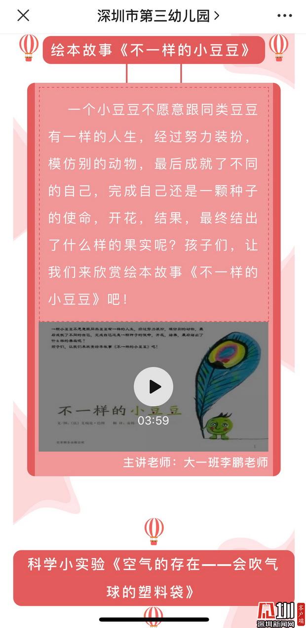 深圳市第三幼兒園園長邱雪華訴記者:“目前,三幼已經(jīng)開啟線上教學(xué)活動(dòng),我們充分運(yùn)用公眾號、微信群等網(wǎng)絡(luò)平臺(tái),與家長、幼兒充分互動(dòng),陸續(xù)推出具有健康促進(jìn)特色的圖文推送,其中包括介紹防疫常識(shí)的攻略、由園長主講的園長電臺(tái),還創(chuàng)辦了每日一期的原創(chuàng)系列游戲,以便家長在家也能獲取適宜的親子游戲活動(dòng)資源?!庇浾咴谏钲谑械谌變簣@的微信公眾平臺(tái)上看到,幼兒園線上互動(dòng)內(nèi)容豐富,其中包括視頻繪本故事、科學(xué)小實(shí)驗(yàn)以及親子體育游戲。每個(gè)版塊均由深圳市第三幼兒園老師們主講示范并錄制視頻,便于孩子及家長學(xué)習(xí)。