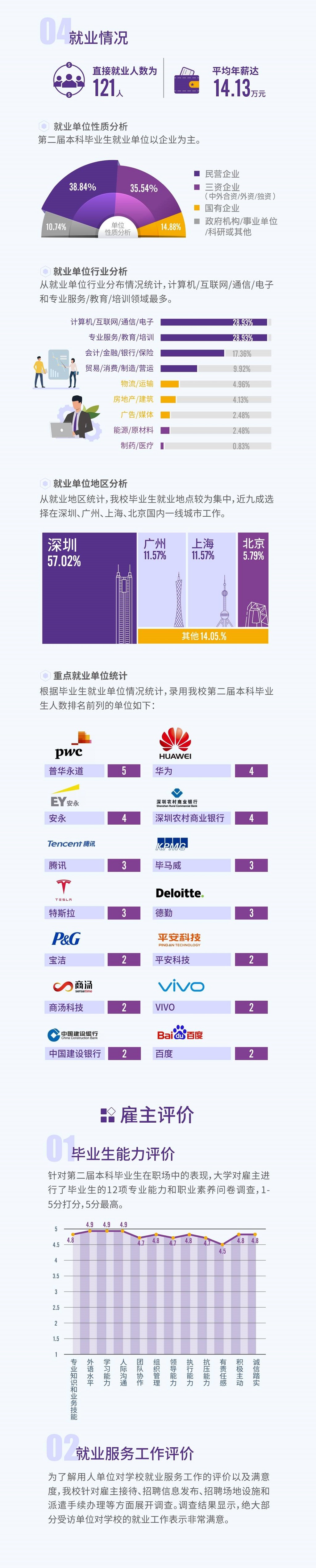 2019年,本科畢業(yè)生就業(yè)單位性質(zhì)更多元。除跨國(guó)公司、民營(yíng)企業(yè)外,更多學(xué)生被國(guó)有企業(yè)、事業(yè)單位青睞。數(shù)據(jù)顯示,第二屆本科畢業(yè)生的就業(yè)單位中,民營(yíng)企業(yè)占38.84%,如華為、百度;三資企業(yè)(中外合資/外資/獨(dú)資)占35.54%,如騰訊、寶潔、可口可樂(lè)、四大會(huì)計(jì)師事務(wù)所;國(guó)有企業(yè)占14.88%;另有10.74%畢業(yè)生受聘于政府機(jī)構(gòu)/事業(yè)單位/科研等機(jī)構(gòu)。