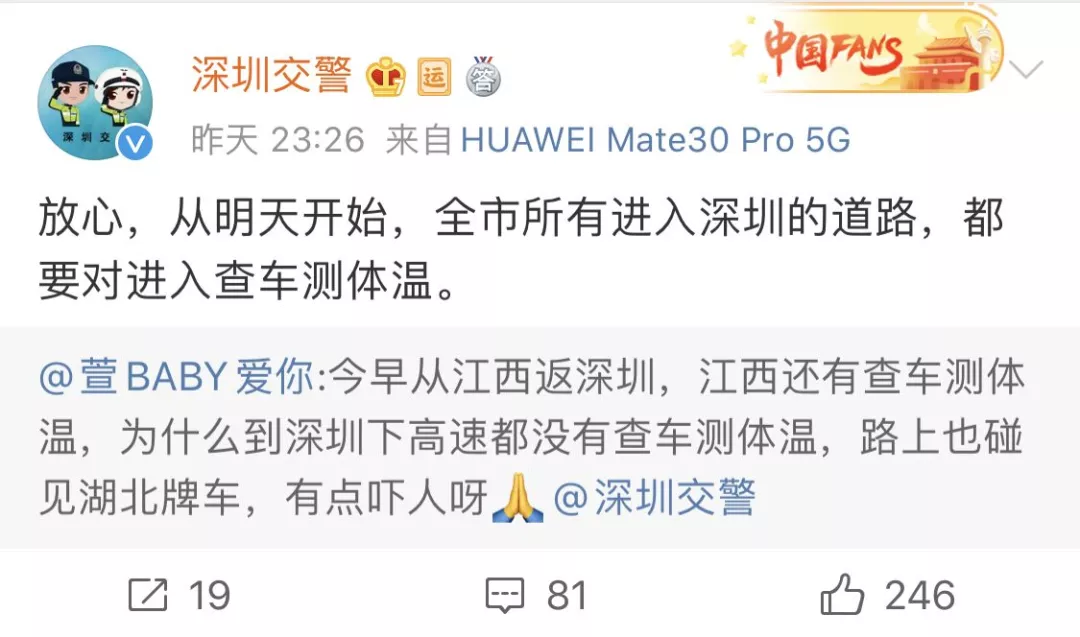 深圳交警表示,全市所有進(jìn)入深圳的道路都要對(duì)進(jìn)入的車輛查車測(cè)體溫。
