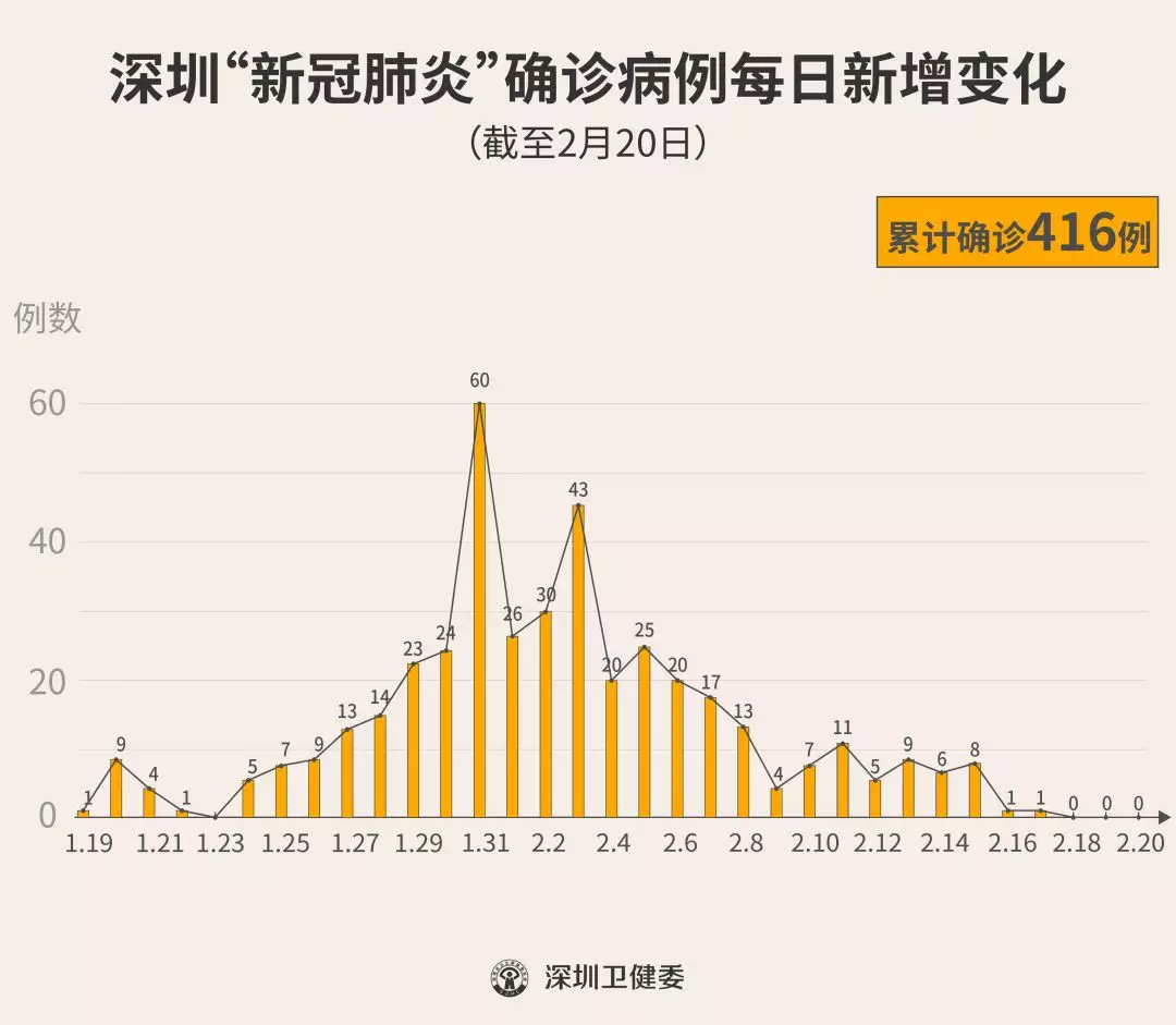 截至2月20日24時,深圳累計報告“新冠肺炎”確診病例416例。2月20日當(dāng)天全市無新增確診病例。