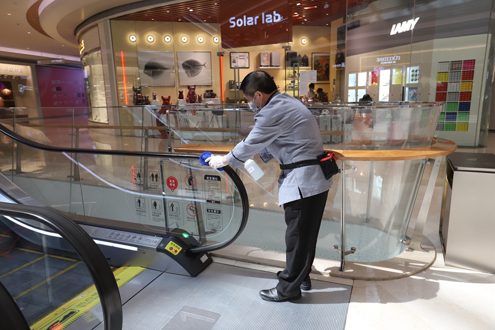 走在商場中,隨時(shí)可以看到保潔人員在消毒清潔。在商場一樓中庭導(dǎo)購屏和導(dǎo)購機(jī)器人處,保潔人員用消毒水反復(fù)擦拭屏幕。據(jù)悉,商場每小時(shí)巡回對扶梯、電梯、衛(wèi)生間、消防通道、導(dǎo)視屏、扶手欄桿、休閑椅、門把手、垃圾房、垃圾桶等地進(jìn)行消毒。