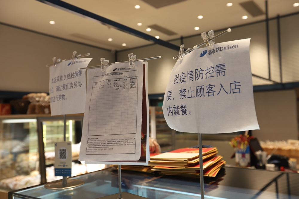 負(fù)二樓的喜薈萃是一家剛開業(yè)沒多久的面包店,記者看到里面燈光明亮、各式面包充盈貨賀,進(jìn)店的通道已全部攔堵,并設(shè)置了取餐及消毒區(qū)。一名市民正在選購面包,他站在店外選好款式后,店員將面包打包好并放在取餐處,市民掃碼付款后就可以帶走了。這就是商場內(nèi)實(shí)行的“零接觸”購物。