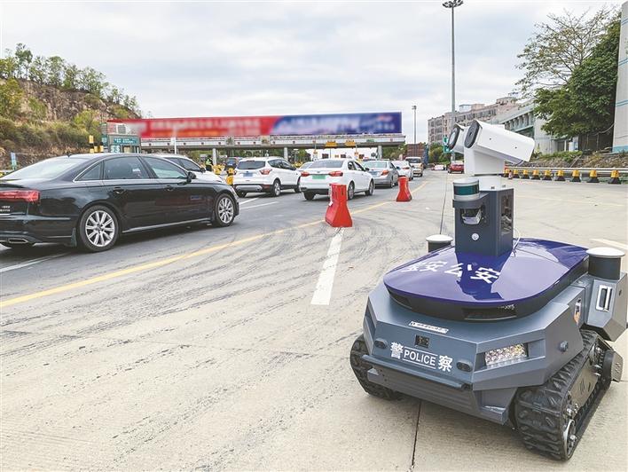 警用巡視機(jī)器人“建國”在深圳高速路口執(zhí)行巡邏任務(wù)。