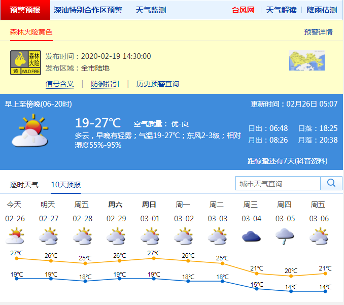 見圳客戶端·深圳新聞網2020年2月26日訊 市氣象局消息,深圳26日多云間晴天,早晚有輕霧或霧,氣溫19-27℃,東風2-3級,相對濕度55%-90%;2月27日至3月3日多云為主,白天天氣溫暖,早晚有輕霧,27日東部沿海和海區(qū)有6-7級陣風。