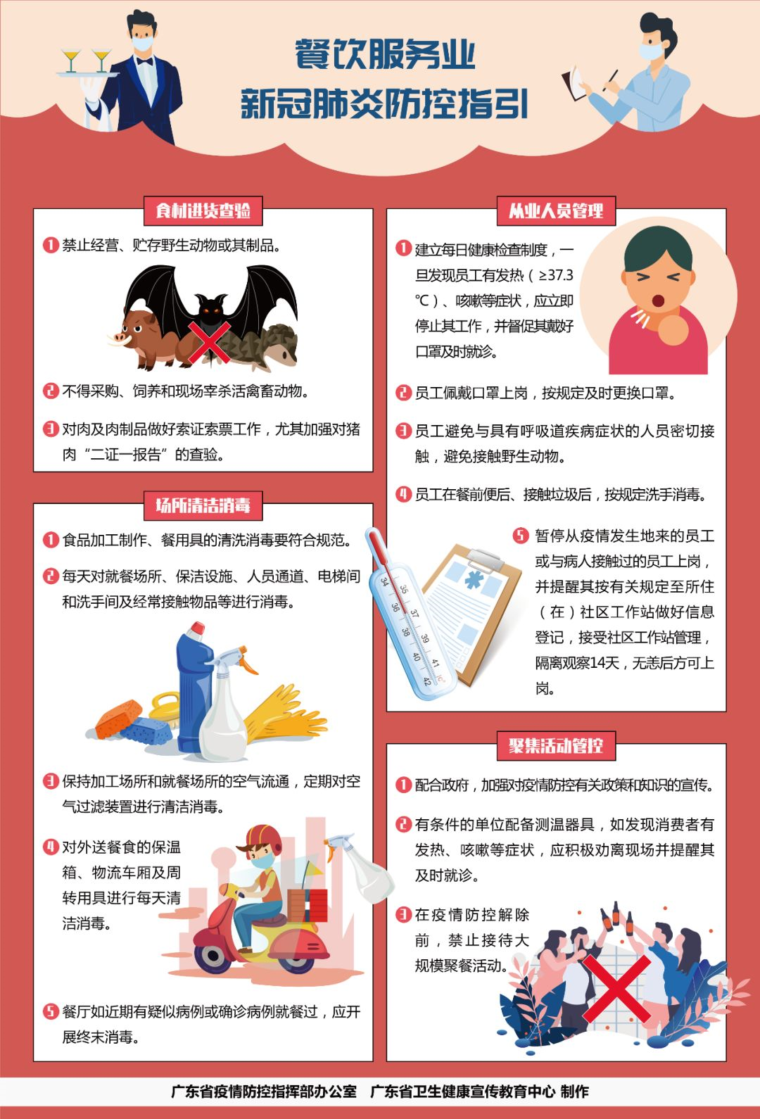 1、嚴格按照《機關(guān)、企業(yè)及工廠節(jié)后復工防控新型冠狀病毒肺炎工作指引》(粵衛(wèi)疾控函〔2020〕14號)、《餐飲服務食品安全操作規(guī)范》要求以及國家衛(wèi)生健康委員會《新型冠狀病毒感染的肺炎防控方案》《新型冠狀病毒感染的肺炎公眾防護指南》等防控要求,建立健全防控制度,壓實防控責任,嚴格從業(yè)人員管理,杜絕從業(yè)人員帶病上崗。