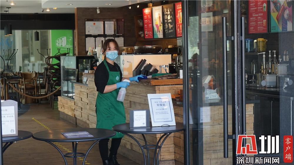 咖啡館都采用門(mén)口取餐帶走的銷(xiāo)售模式,圖為正在進(jìn)行消毒情節(jié)的員工。