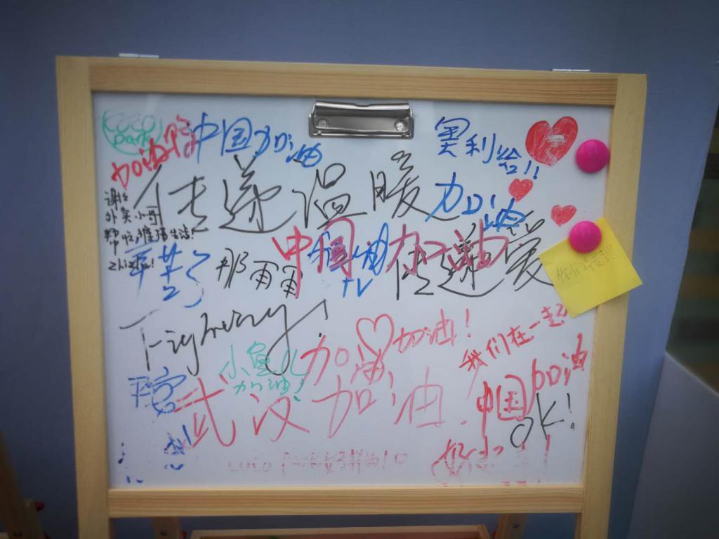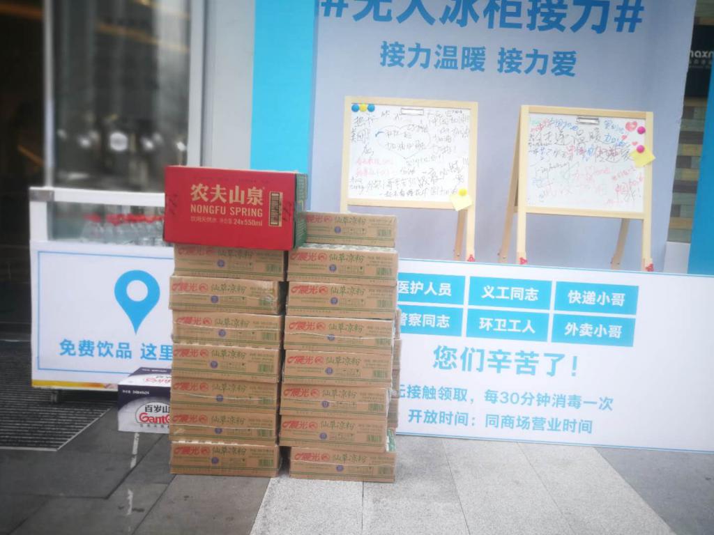記者留意到,無人冰柜旁,一張碩大的告示牌上寫著"無人冰柜接力,接力溫暖接力愛",告示牌的下方,還特意標(biāo)注"醫(yī)護(hù)人員、警察同志、義工同志、環(huán)衛(wèi)工人、快遞小哥、外賣小哥,你們辛苦了"的字樣。告示牌前,還架著兩塊白板,上面寫滿了諸如"武漢加油""傳遞溫暖""一起看櫻花"等市民的真情告白。告示牌旁,擺放著二十幾箱晨光仙草涼粉,以及成箱的百歲山、農(nóng)夫山泉等品牌的礦泉水,冰柜里還有可口可樂以及一些涼茶飲料。柜體上,清晰地標(biāo)注了"免費飲品,這里領(lǐng)取。"