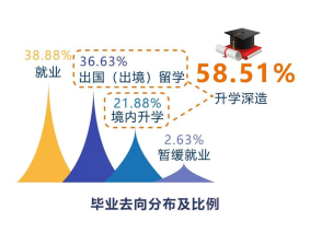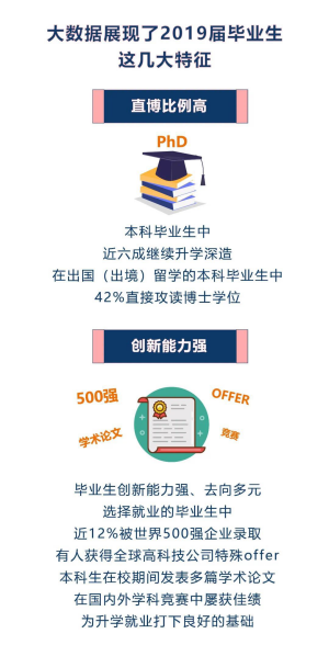 從本科畢業(yè)生升學情況來看,有超六成同學選擇了境外留學,其中四成為直博。在2019屆畢業(yè)生里,直博人數(shù)為144人,占全體畢業(yè)生近20%。