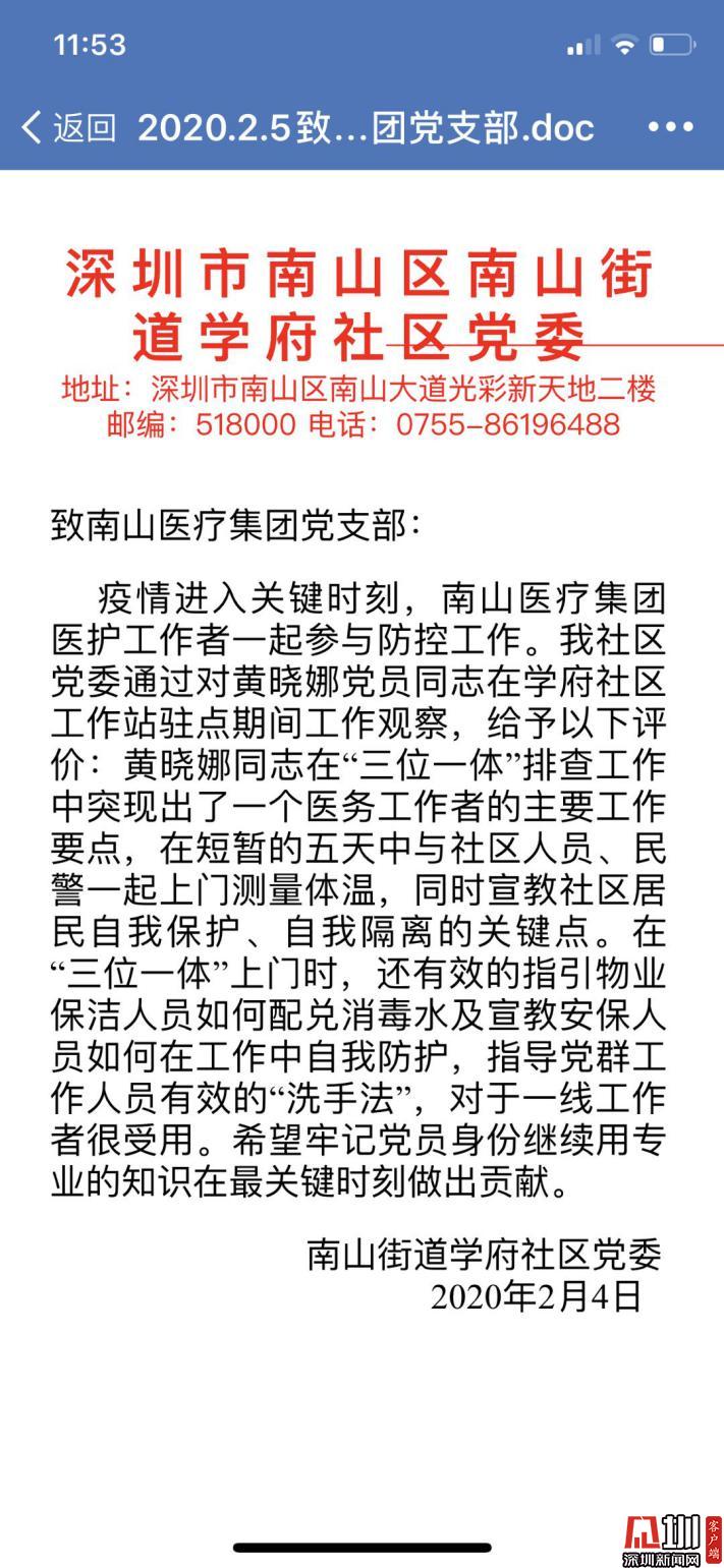 在學(xué)府社區(qū)工作站駐點期間,黃曉娜用專業(yè)知識在控制疫情最關(guān)鍵時刻,為社區(qū)居民做出貢獻(xiàn),并收到了南山區(qū)南山街道學(xué)府社區(qū)黨委的感激表揚(yáng)。