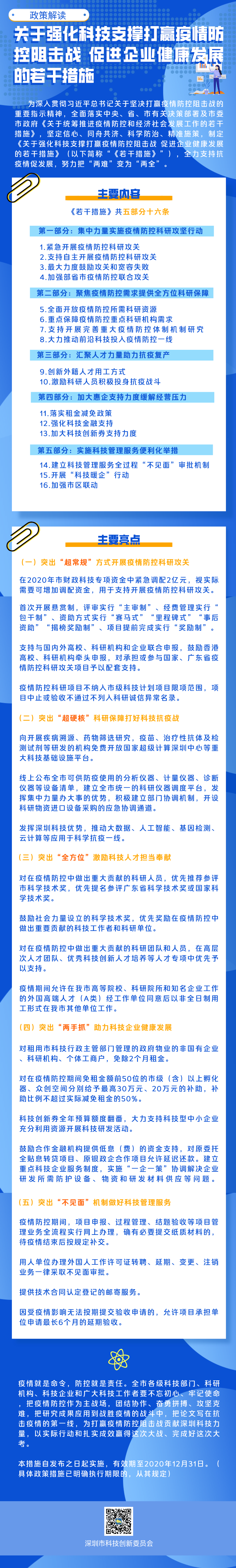 見圳客戶端·深圳新聞網(wǎng)2020年3月3日訊(見圳客戶端、深圳新聞網(wǎng)記者 陳婕)為深入貫徹習(xí)近平總書記關(guān)于堅決打贏疫情防控阻擊戰(zhàn)的重要指示精神,深圳市科技創(chuàng)新委員會制定《關(guān)于強化科技支撐打贏疫情防控阻擊戰(zhàn)促進企業(yè)健康發(fā)展的若干措施》(以下簡稱“《若干措施》”),《若干措施》共五部分十六條,其中,突出“超常規(guī)”方式,在2020年財政科技專項資金中緊急調(diào)配2億元,視實際需要可增加調(diào)配資金,用于支持開展疫情防控科研攻關(guān),努力把“兩難”變?yōu)椤皟扇薄?/p>