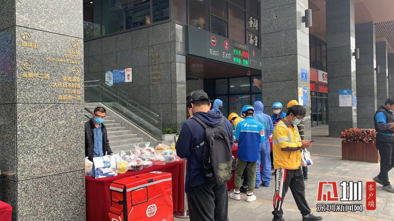 科興科學園整個園區(qū)分為東、西、南、北四個入口,外賣人員只能夠將餐品放置在取餐點,園區(qū)有專門的工作人員身著防護服對送餐人員進行體溫檢測和防止人員聚集。