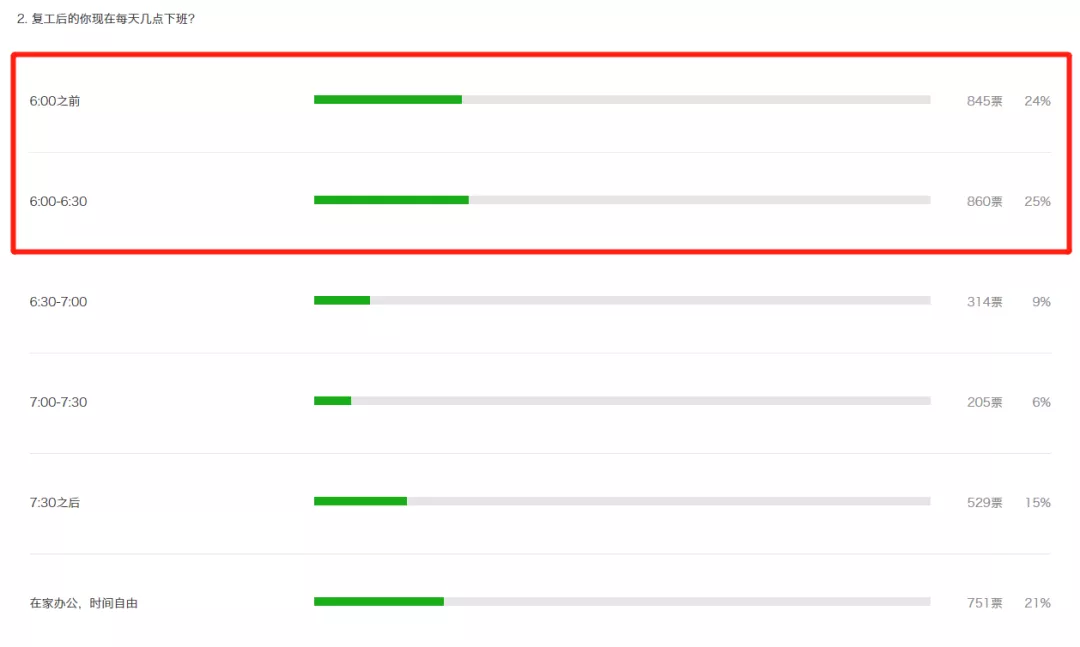 而復工后,大多人都集中在18時30分前下班。其中,18時前下班的占24%,18時至18時30分下班的占25%。