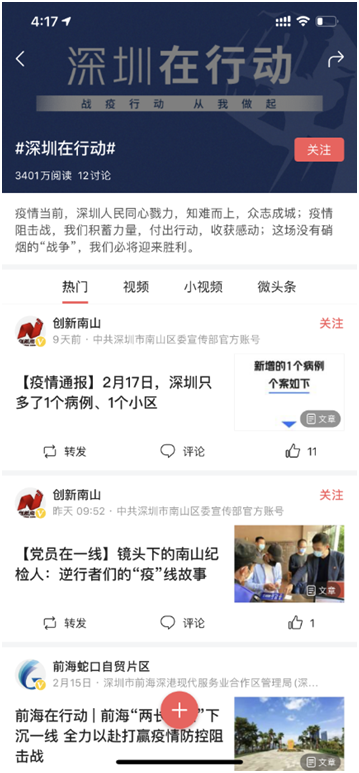 今日頭條話題#全民共抗肺炎深圳在行動(dòng)#共計(jì)3401萬(wàn)閱讀量,文章參與數(shù)130余篇。