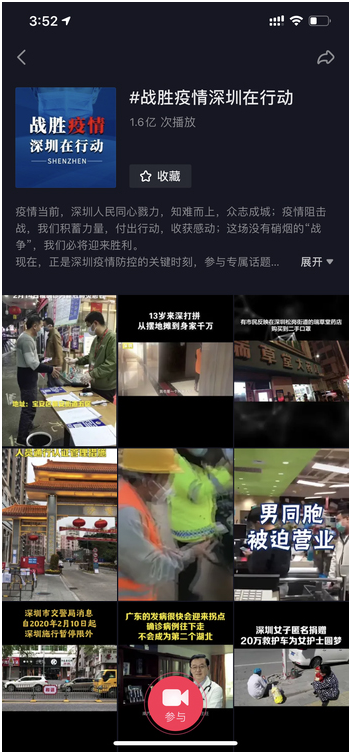 疫情防控期間,深圳市的政務(wù)頭條號(hào)和政務(wù)抖音號(hào)也“大放異彩”。以今日頭條和抖音兩個(gè)熱門(mén)平臺(tái)來(lái)看,抖音話題#戰(zhàn)勝疫情深圳在行動(dòng)#截至2月26日已累計(jì)1.6億次播放,參與視頻數(shù)262個(gè)。
