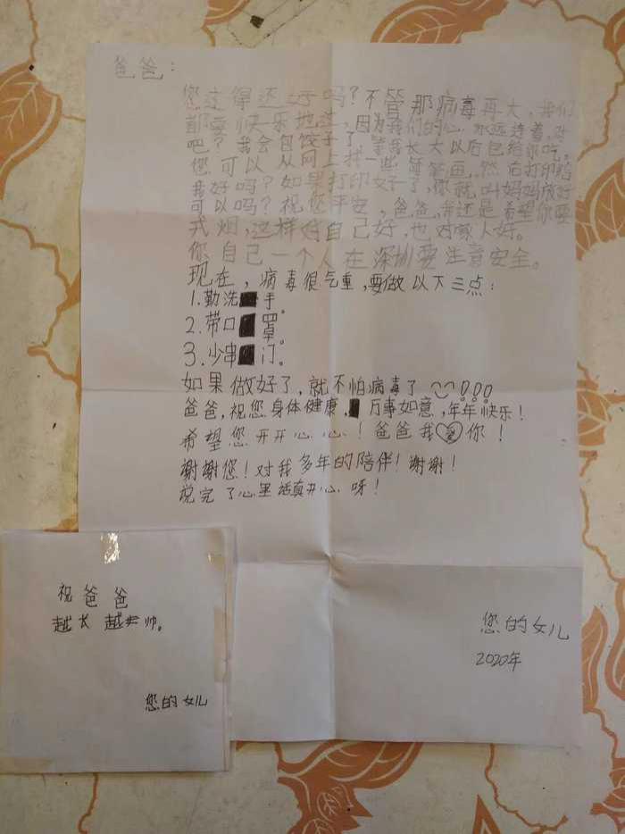 深圳晚報(bào)2020年3月9日訊 "爸爸:您過(guò)得還好嗎?不管那病毒再大,我們都要快樂(lè)地過(guò),因?yàn)槲覀冃倪B在一起……"日前,白云飛收到一封9歲女兒白家茵在高州老家給他郵寄的信件??粗畠喊l(fā)來(lái)的一行行文字,白云飛動(dòng)容地說(shuō)道,"原本答應(yīng)她過(guò)年帶她去沙灘,聽(tīng)到我說(shuō)要提前回深圳與病毒作斗爭(zhēng),還叮囑我一人在外注意安全。"紙短情長(zhǎng),他感覺(jué)自己的女兒長(zhǎng)大了,他為女兒的堅(jiān)強(qiáng)懂事而感動(dòng)和自豪。"由于工作原因,爸爸需要提前回到工作崗位。等疫情過(guò)后,爸爸也抽時(shí)間好好陪你一下哈……"白云飛字里行間寫(xiě)下了對(duì)女兒的愧疚之情。
