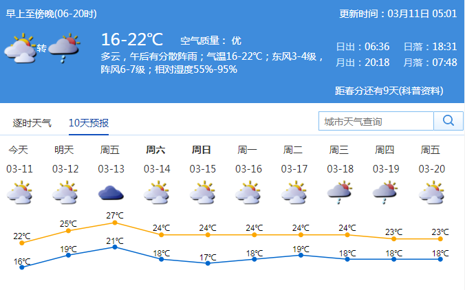 見圳客戶端·深圳新聞網2020年3月11日訊 據市氣象臺消息,今日深圳多云,午后有分散陣雨;氣溫16-22℃;東風3-4級,陣風6-7級;相對濕度55%-95%。