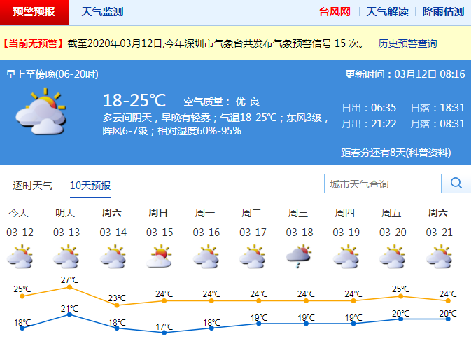 見圳客戶端·深圳新聞網(wǎng)2020年3月12日訊 深圳12-13日多云,氣溫明顯回升,溫暖濕潤,早晚有輕霧或霧和分散小雨,12日氣溫18-25℃;13日夜間受冷空氣影響,有陣雨,沿海、高地和海區(qū)有6-7級陣風;14-15日多云,氣溫略降,早晚稍涼;16-17日多云天氣溫暖。