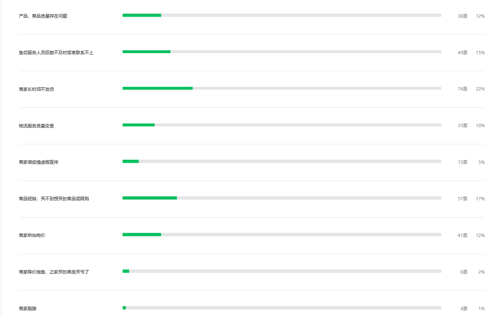 不少市民表示,疫情期間“在線消費(fèi)”遇到過問題。其中,長(zhǎng)時(shí)間不發(fā)貨、因商品短缺或限購買不到商品、售后服務(wù)人員回復(fù)不及時(shí)或聯(lián)系不上位列市民消費(fèi)不滿意榜前三;而商品質(zhì)量存在問題、商家哄抬物價(jià)則并列消費(fèi)不滿意榜第四。