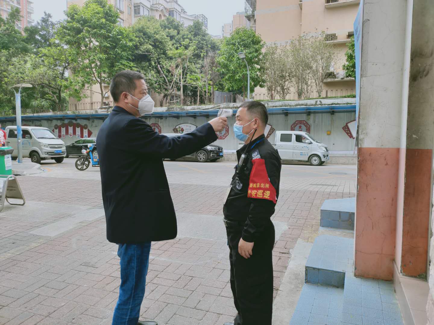 “梁經(jīng)理,我也是一名黨員,我申請(qǐng)加入咱們小區(qū)的疫情防控隊(duì)伍?!痹诓趟龠_(dá)的帶動(dòng)下,兒子蔡榮釗也積極投身防控“疫”線中。每日下班后,他都從寶安的工作單位趕回小區(qū),來(lái)到門(mén)崗卡點(diǎn),為進(jìn)出小區(qū)人員進(jìn)行登記、測(cè)量體溫,攔截外來(lái)人員和車輛。蔡榮釗這一堅(jiān)持,就是一個(gè)多月,得到了物業(yè)管理處和業(yè)主(住戶)們的高度好評(píng)。