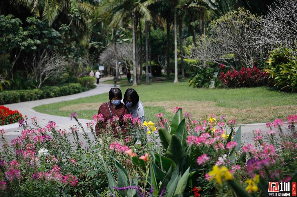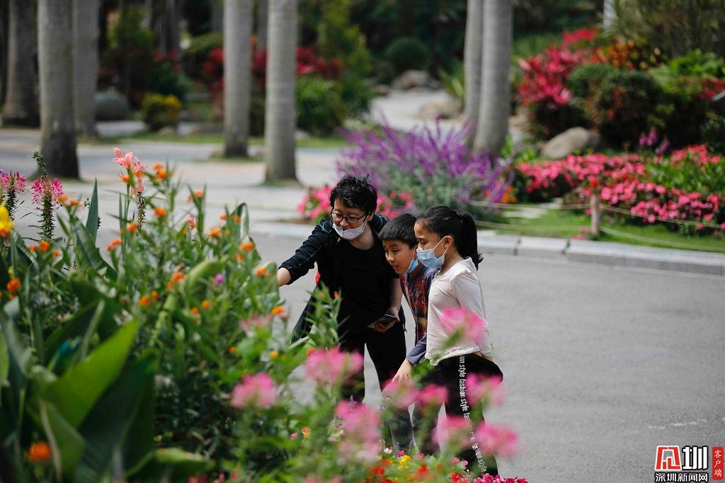 蓮花山公園一角,鮮花盛開,一位家長正為她的孩子拍照。