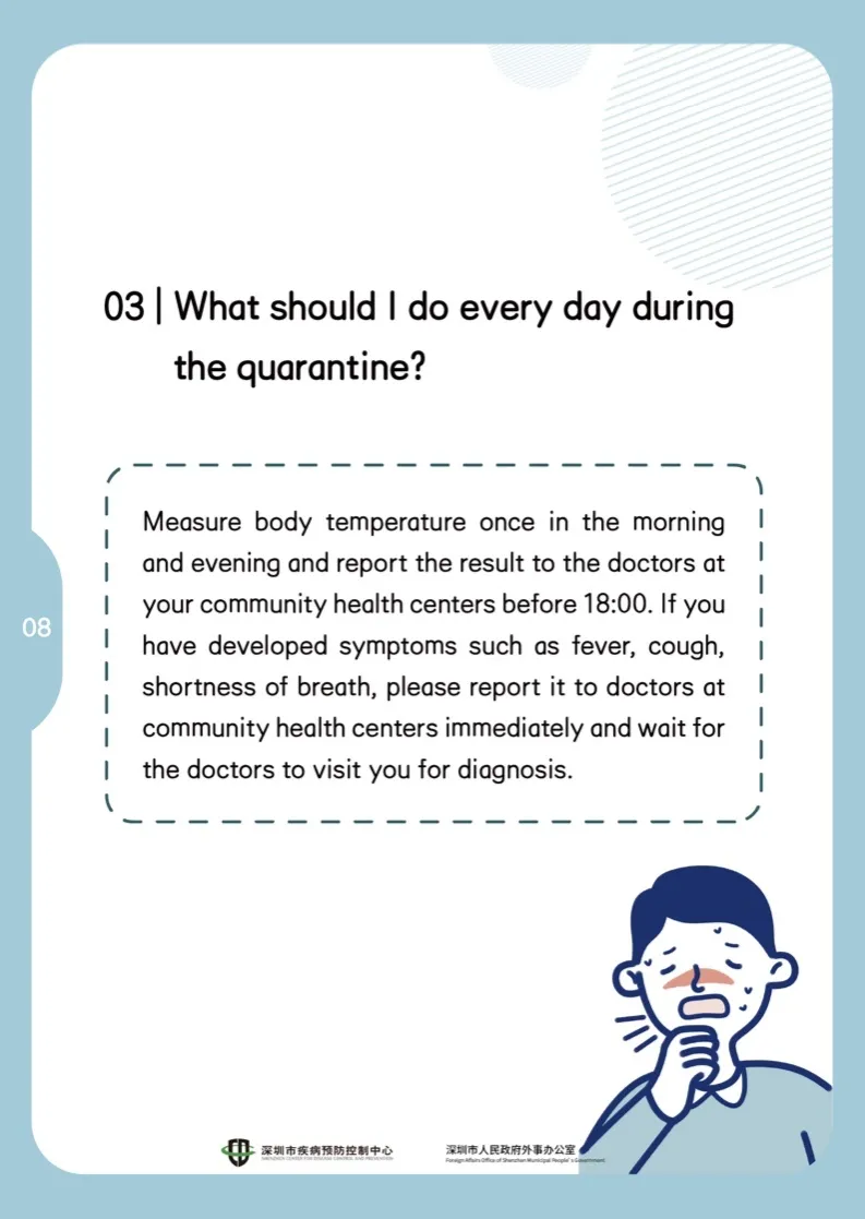 應在早、晚各測量一次體溫,并于每天18∶00時前報告給社康醫(yī)生。如果出現(xiàn)有發(fā)熱、咳嗽、氣促等癥狀,應立即向社康醫(yī)生報告,社康醫(yī)生會上門診斷。