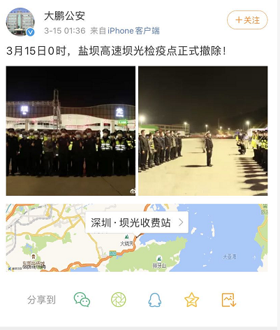 3月15日,深圳撤銷全部49個(gè)入深車輛道路交通聯(lián)合檢疫點(diǎn),各條入深道路恢復(fù)正常通行。