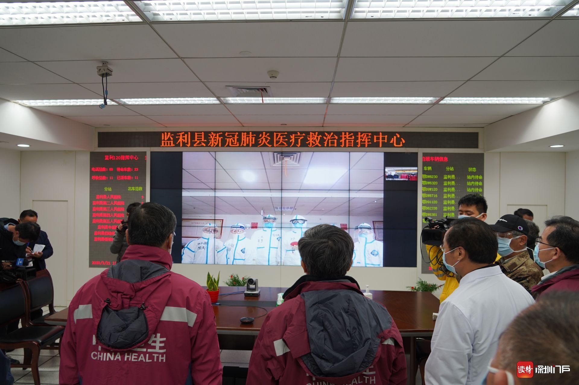 2月21日,監(jiān)利縣人民醫(yī)院指揮中心,廣東省醫(yī)療隊前指領導與縣中醫(yī)院ICU里的廣東醫(yī)療隊隊員進行視頻連線。
